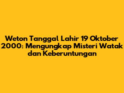 Weton tanggal lahir 19 Oktober 2000 adalah Kamis Wage. Weton ini memiliki pengaruh yang signifikan terhadap watak, karakteristik, rezeki, dan keberuntungan seseorang. Orang yang lahir pada weton Kamis Wage dikenal cerdas, kreatif, memiliki jiwa sosial yang tinggi, namun juga cenderung keras kepala. Mereka diramalkan memiliki rezeki yang cukup baik dan cocok bekerja di bidang yang membutuhkan kreativitas dan kemampuan berpikir logis.